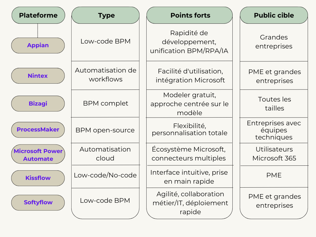 Le marché du BPM et de l’automatisation des processus est riche et compétitif. Si Bizflow est un acteur solide, plusieurs autres plateformes proposent des approches différentes qui peuvent mieux correspondre à certains besoins. Voici un comparatif des principales alternatives :