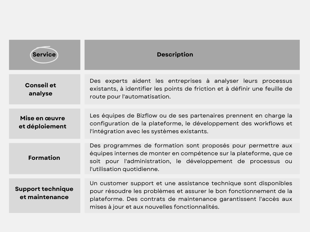 Au-delà de sa plateforme logicielle, Bizflow et son réseau de service providers proposent un ensemble de services pour accompagner les entreprises dans leurs projets de business process management. Ces services couvrent l’ensemble du cycle de vie d’un projet BPM, de la conception à la maintenance. L’offre de solution de Bizflow ne se limite pas à la fourniture d’un outil, mais vise à être un partenariat stratégique pour la transformation digitale.