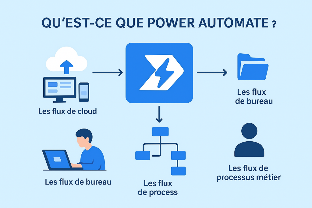 »’Microsoft Power Automate est un service cloud de Microsoft qui permet aux utilisateurs de créer des flux de travail automatisés, appelés « flux », pour connecter différentes applications et services. L’objectif principal de Power Automate est de permettre l’automatisation des tâches répétitives et chronophages, libérant ainsi du temps pour des activités à plus forte valeur ajoutée. Anciennement connu sous le nom de Microsoft Flow, ce service a été rebaptisé en novembre 2019 pour mieux refléter son rôle central dans la stratégie d’automatisation de Microsoft. Il fait partie intégrante de la Microsoft Power Platform, aux côtés de Power BI, Power Apps et Power Virtual Agents, offrant une suite complète d’outils low-code pour analyser les données, créer des applications et automatiser les processus. Power Automate est un outil puissant qui s’adresse aussi bien aux utilisateurs métier sans compétences techniques qu’aux développeurs, grâce à son interface intuitive et à ses fonctionnalités avancées. Pour un aperçu officiel, vous pouvez consulter la page de Microsoft Power Automate. La plateforme propose plusieurs types de flux pour répondre à des besoins variés :