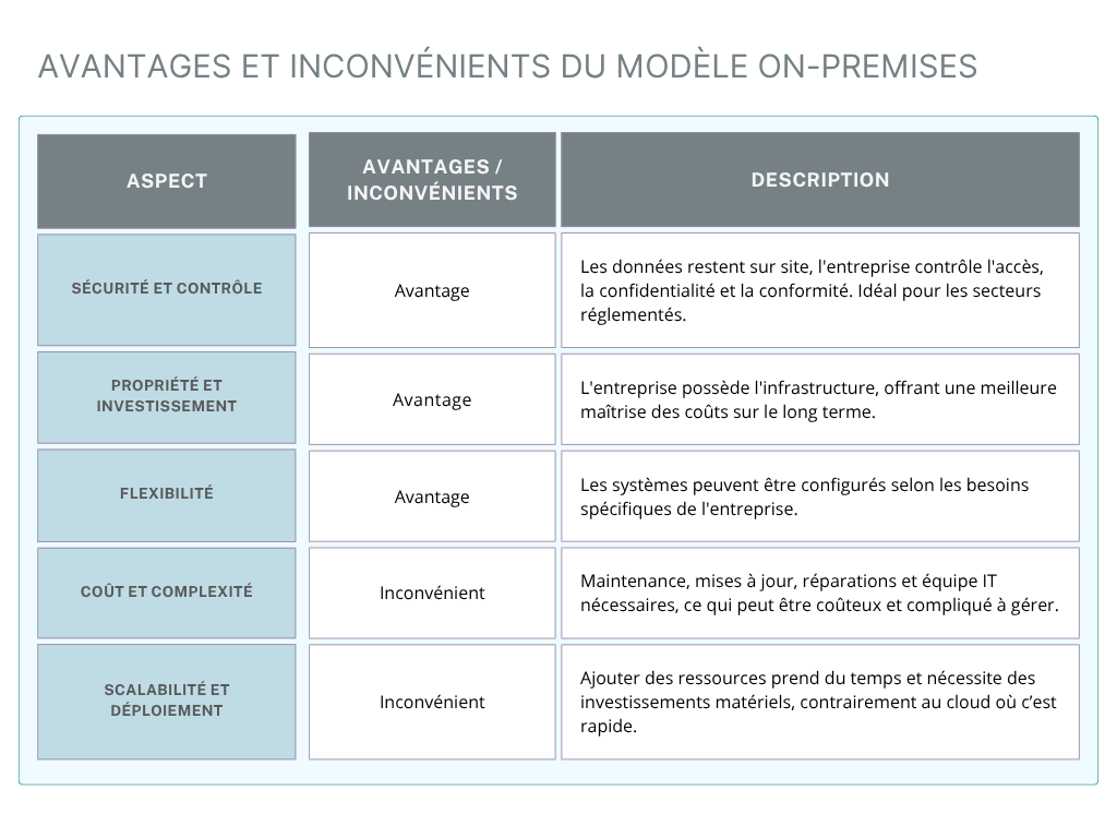 L’on-premises demeure une solution pertinente pour les entreprises qui prioritisent le contrôle total, la sécurité renforcée et la souveraineté des données. Bien que l’investissement initial soit conséquent et que la complexité de gestion soit importante, cette approche offre des avantages durables pour les organisations ayant des besoins spécifiques ou des exigences réglementaires strictes.