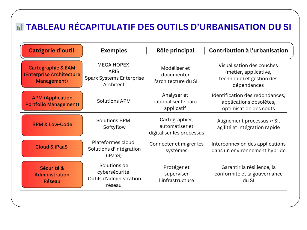 La démarche d’urbanisation des systèmes est soutenue par une panoplie d’outils logiciels qui aident à cartographier et gouverner le système d’information. On peut les classer en plusieurs catégories. Premièrement, les plateformes de cartographie (EAM – Enterprise Architecture Management) comme MEGA HOPEX, ARIS ou Sparx Systems Enterprise Architect. Ces solutions permettent de créer et de maintenir le registre du SI, en décrivant les différentes couches et leurs relations. Elles proposent des vues graphiques qui simplifient la compréhension de l’architecture technique et du paysage logiciel.